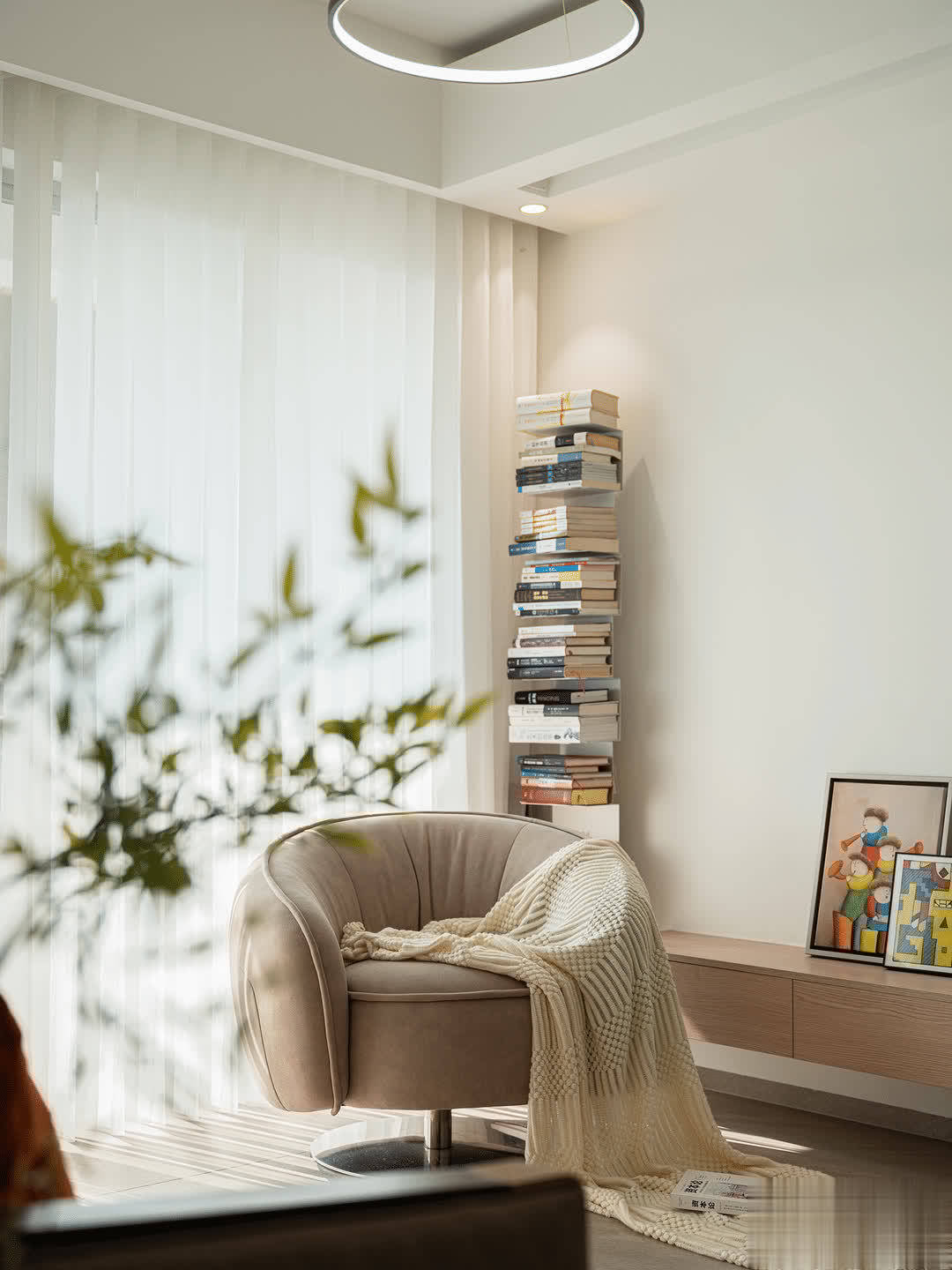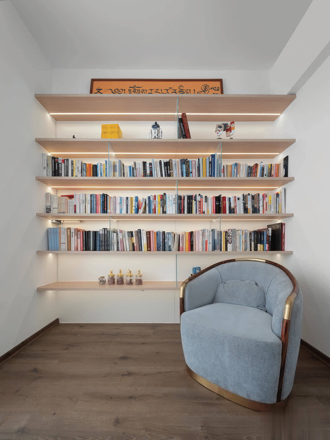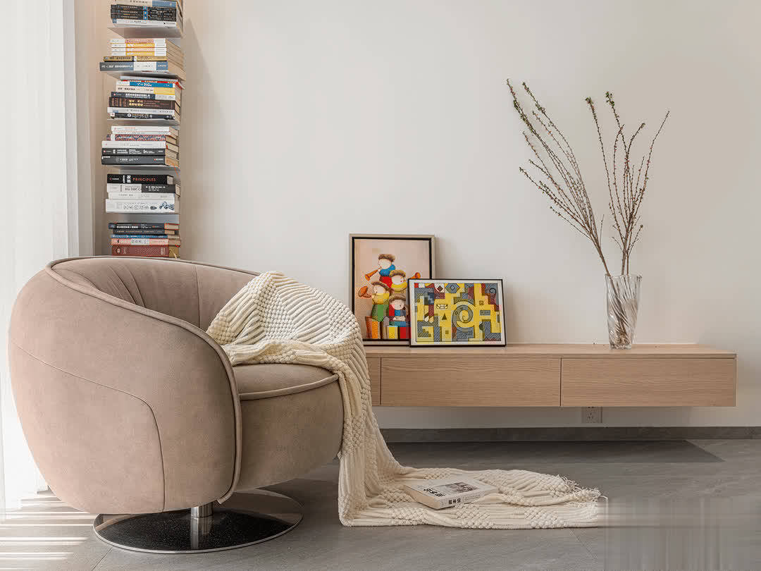客厅的氛围是非常轻松舒缓的,落地书架,随处可见的阅读空间,营造出舒适的环境,符合他追求随时能阅读的装修理念。