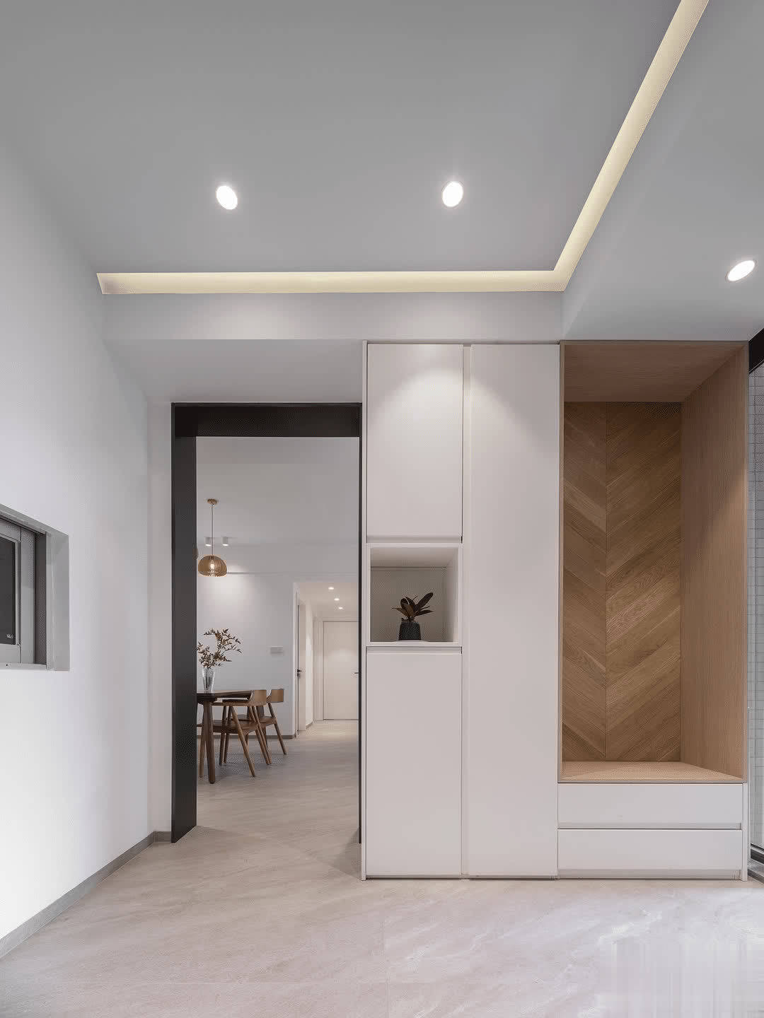 在吊柜位置开放格内加灯带,带来温馨视觉效果的同时也让小空间更显灵动。靠近玄关处,墙面还开了个“小窗”,这样设计增加通透性不说,还能与玄关形成互动。