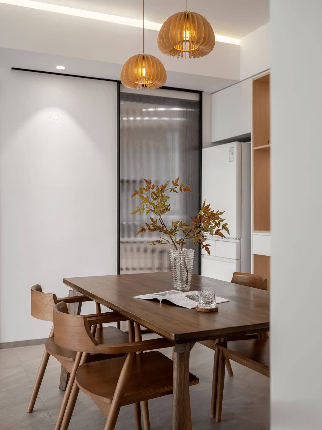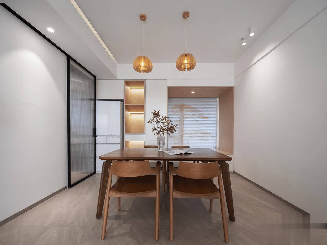 整个餐厅除了餐桌餐椅,就没有过多的家具,甚至连装饰画都没有。小哥不断给空间减负,看后让人一身轻松。但绿植不能少,在餐桌上,在客厅里都有绿色植物,营造出清新的空间环境。