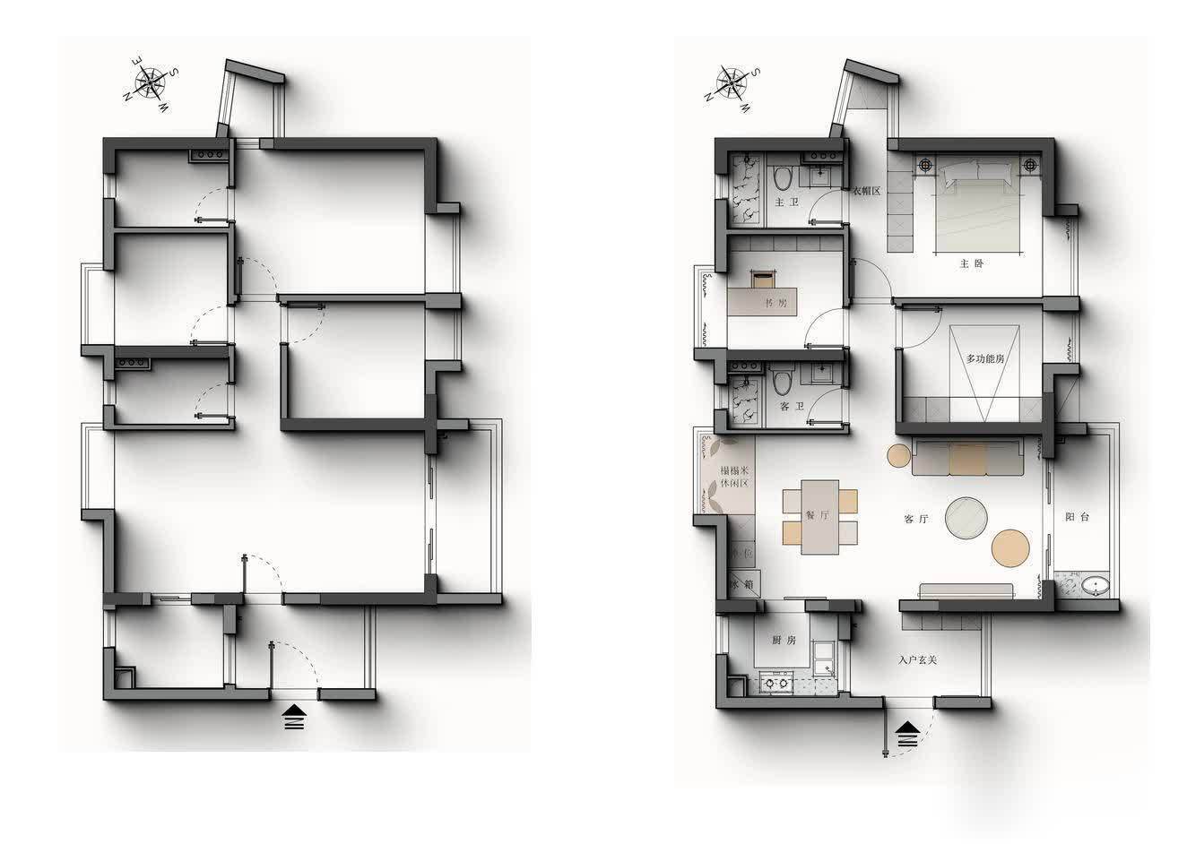 原始结�平方米三室两厅两卫,空间利用率很高。原始户型基本就能满足生活需求,为了省点钱,做平面布置的时候能不动就不动,减少拆改和砌墙的费用。所以也只是做𱄿处微调整: