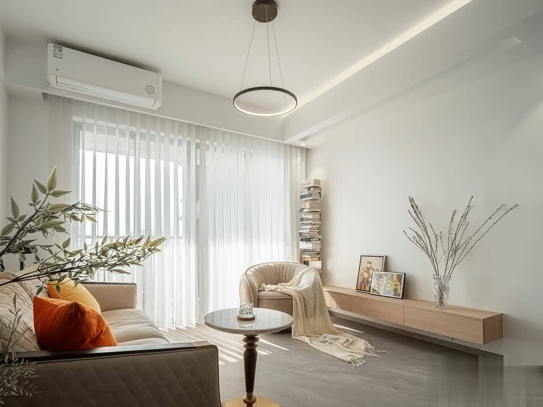 客厅没有做大平顶,因为整个顶拉平费用也高很多,但还是做了薄薄的边顶,增加层次感。这里除了没有放茶几功能外,甚至连背景也没有,没有背景的空间+全屋白色显得很干净,至于电视机等以后再说吧。当然也没有学别人装中央空调,如果预算够的话,装中央空调空间更加简约美观,但现在看来,装挂机也不影响颜值。
