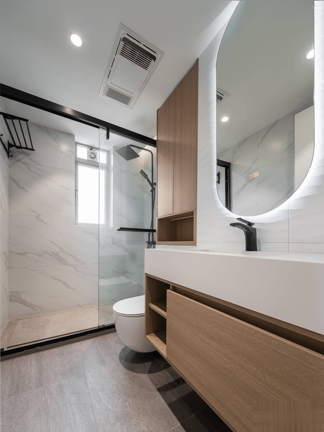 最后是卫生间了,两个卫生间都是整屋原木色与白墙的简单配色,简单、干净,实用就够了,不需要铺那些花里胡哨的砖,而且还是选大砖,人工费比小砖便宜,住进去后还更好打理。